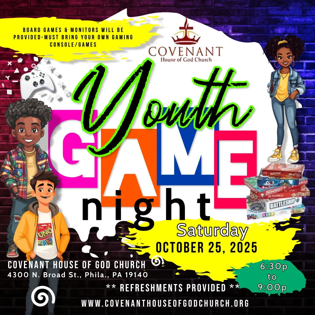 You’re invited to join us for an exciting Youth Game Night at Covenant House of God Church! Come enjoy a safe and friendly evening filled with laughter, good company, and great food. We’re creating a fun environment for youth to relax and connect through gaming and fellowship.